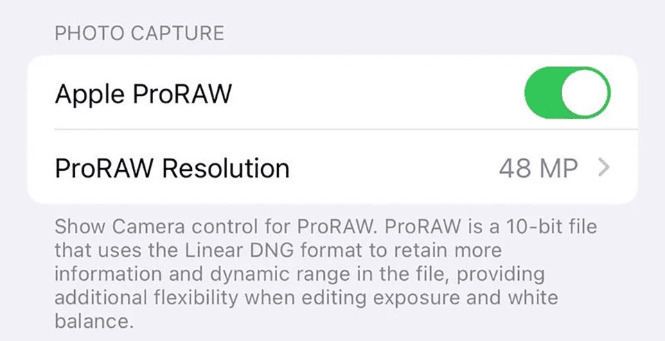 Để bật tính năng này lên, các bạn vào Cài đặt → Camera → Định dạng → Bật Apple ProRAW. Khi bật bên dưới sẽ có 2 tùy chọn 12MP hay 48MP, nếu bật 48MP thì sẽ tốn nhiều dung lượng hơn, bùi lại chất lượng ảnh cũng sẽ cao hơn.