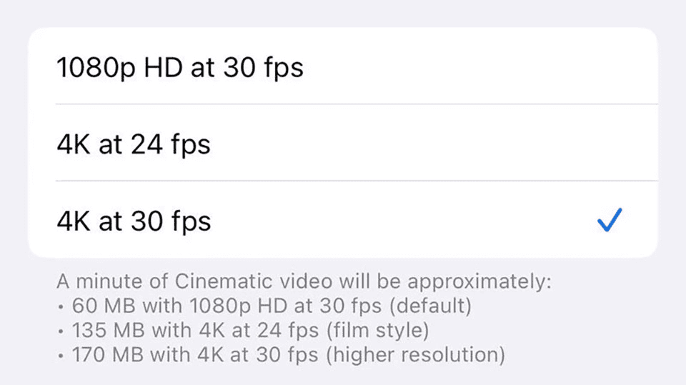 Ngoài các nâng cấp về chụp ảnh thì Cinematic Mode cũng được Apple nâng cấp lên 4K@30fps. Tuy nhiên mặc định của máy sẽ là 1080@30fps. Để bật tùy chỉnh độ phân giải cao trên Cinematic Mode, các bạn vào Cài đặt → Camera → Quay video điện ảnh → bật 4K@30fps.