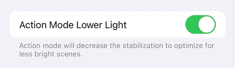 Để bật tính năng tối ưu hóa Action Mode trong điều kiện thiếu sáng, các bạn vào Cài đặt → Camera → Quay video → bật Chế độ hành động ánh sáng yếu hơn.