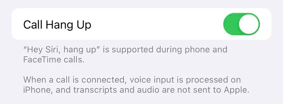 Với iOS 16, bạn có thể nói “Hey Siri, hang up” trong khi gọi điện thoại để kết thúc cuộc gọi mà không cần nhấn nút kết thúc trên màn hình. Nhưng cần lưu ý rằng lệnh này có thể được nghe bởi những người khác trong cuộc gọi. Để sử dụng tính năng này, bạn cần truy cập vào ứng dụng Cài đặt> Siri & Tìm kiếm> Gác máy cuộc gọi.