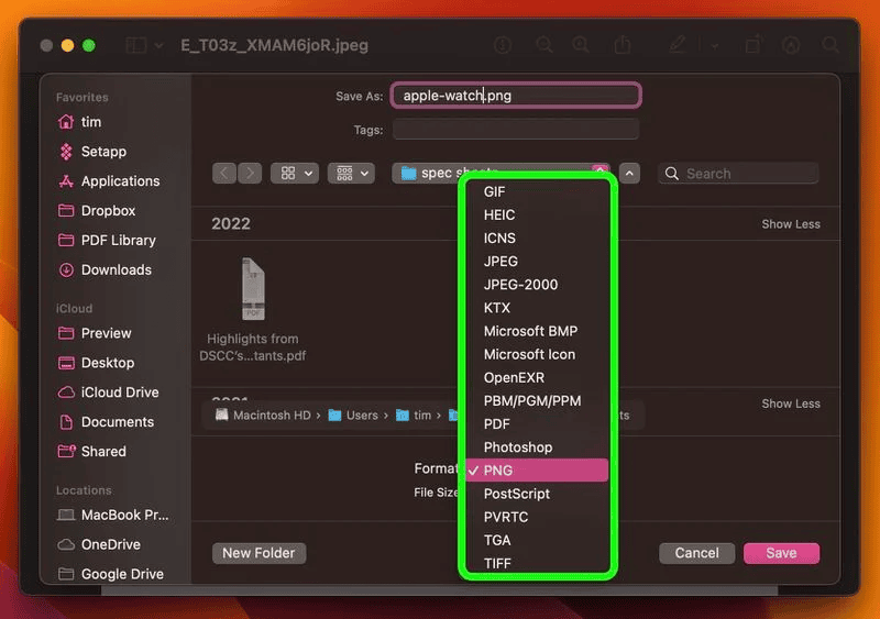 Khi bạn muốn lưu hoặc xuất tệp trong Xem trước, chọn những Option trong menu Định dạng được xổ xuống để có quyền truy cập vào một số loại tệp bổ sung.