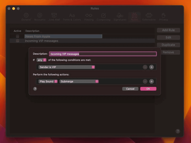 Tiếp theo, bên dưới “Thực hiện các hành động sau:” chọn Phát âm thanh từ danh sách thả xuống đầu tiên. (Một tùy chọn khác có sẵn ở đây là Bounce Icon in Dock). Sau đó, bên dưới “Thực hiện các hành động sau:” đã chọn một âm thanh để phát từ trình đơn thả xuống thứ hai. Cuối cùng, nhấn OK, sau đó nhấn Apply. Với quy tắc hiện đã được thiết lập, bạn sẽ nhận được một cảnh báo duy nhất cho mỗi thư VIP mà bạn nhận được mà bạn sẽ có thể phân biệt với các thông báo thư mới thông thường khi chúng được gửi đi.