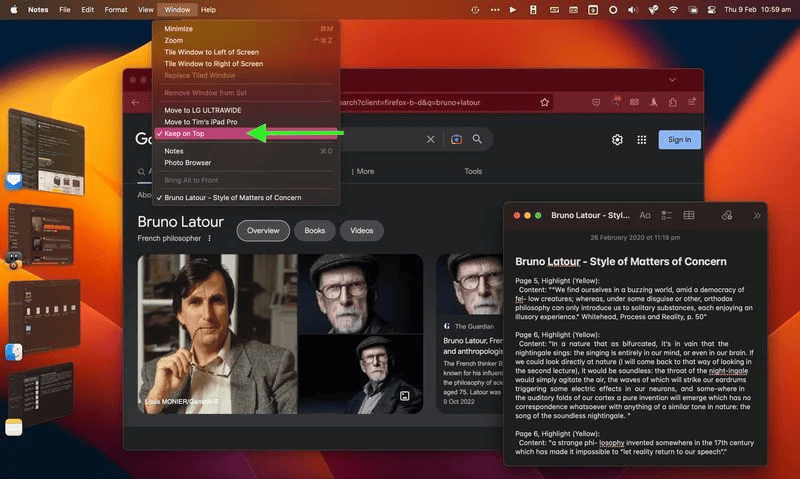 Để làm nổi một ghi chú trong ứng dụng Ghi chú, bấm hai lần vào ghi chú để mở nó trong một cửa sổ riêng, sau đó chọn Cửa sổ -> Giữ trên cùng từ thanh menu. Giờ đây, ghi chú sẽ vẫn ở phía trên các cửa sổ ứng dụng đang mở khác, ngay cả khi bạn chuyển đổi giữa các ứng dụng bằng Stage Manager. Chỉ cần nhớ rằng các ghi chú nổi của bạn không thể chia sẻ cùng màn hình với một ứng dụng khác ở chế độ toàn màn hình.