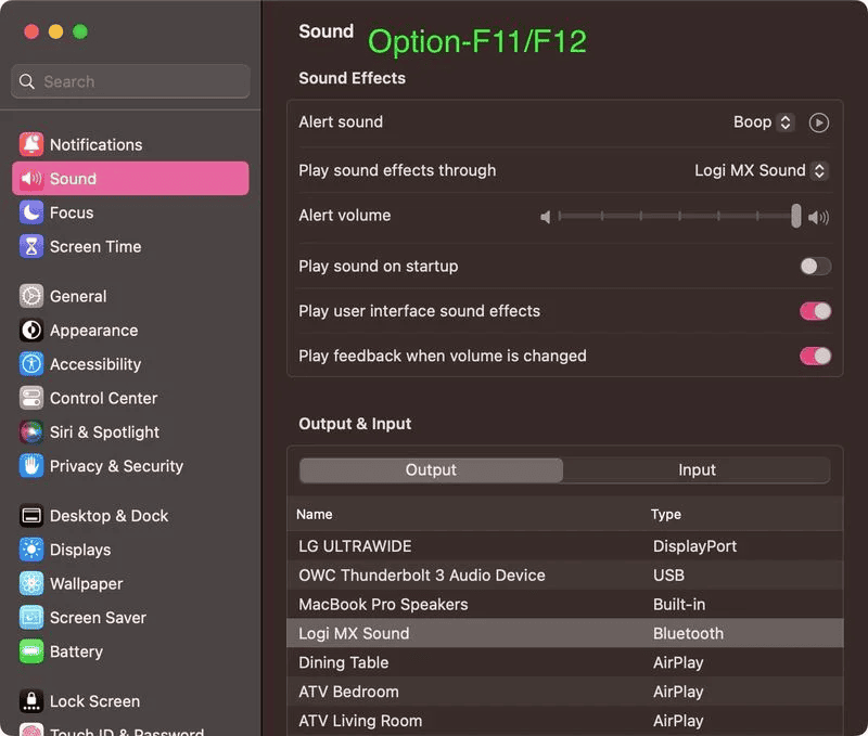 Nếu bạn nhấn giữ Option khi nhấn một trong các phím này, các tùy chọn cụ thể trong Cài đặt hệ thống được liên kết với tính năng này sẽ mở ngay lập tức. Ví dụ, Option-F11/12 sẽ mở ngăn Âm thanh.