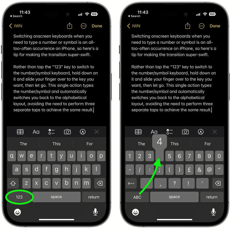 Thay vì nhấn vào phím “123” để chuyển sang bàn phím số/ký hiệu, hãy giữ phím đó và trượt ngón tay của bạn đến phím bạn muốn, sau đó thả ra. Hành động đơn lẻ này nhập số/ký hiệu và tự động chuyển bạn trở lại bố cục theo thứ tự bảng chữ cái, tránh phải thực hiện ba lần nhấn riêng biệt để đạt được kết quả tương tự.