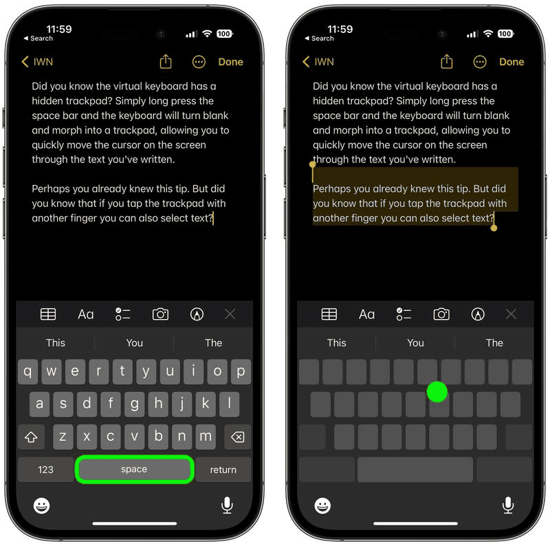 Bạn có biết bàn phím ảo có một trackpad ẩn? Chỉ cần nhấn và giữ phím cách và bàn phím sẽ chuyển sang trạng thái trống và biến thành bàn di chuột, cho phép bạn nhanh chóng di chuyển con trỏ trên màn hình qua văn bản bạn đã viết.