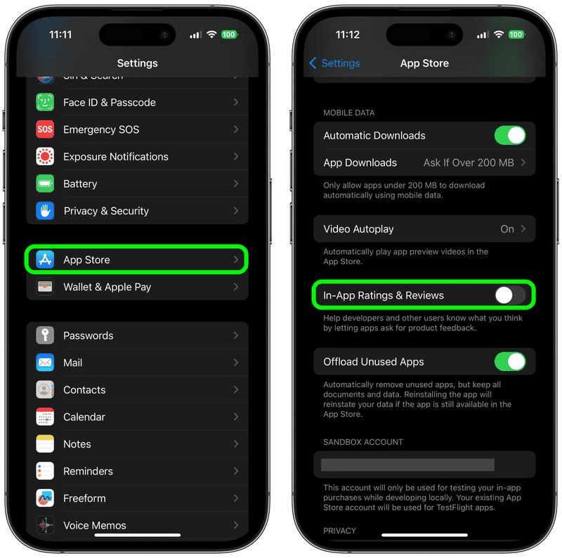 May mắn thay, bạn có thể dễ dàng tắt chúng đi. Đi tới Cài đặt -> App Store và tắt công tắc bên cạnh Xếp hạng & Đánh giá trong ứng dụng.