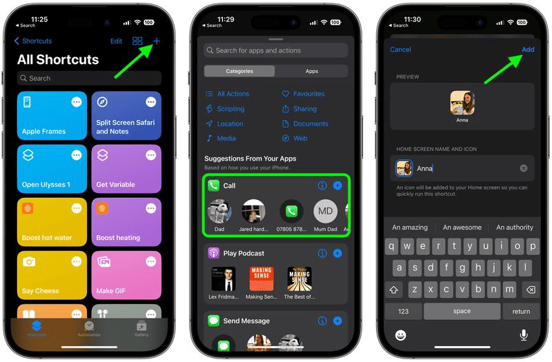 Mở ứng dụng Phím tắt và nhấn nút + ở góc trên cùng bên phải. Chạm vào Thêm hành động, sau đó chọn một trong các liên hệ được đề xuất từ hàng Cuộc gọi. Tiếp theo, chạm vào nút Chia sẻ ở dưới cùng và chọn Thêm vào Màn hình chính từ menu hành động. Đặt tên cho lối tắt của bạn và nhấn vào biểu tượng để chọn ảnh của liên hệ nếu bạn có, sau đó nhấn Thêm để đặt nó trên Màn hình chính của bạn.