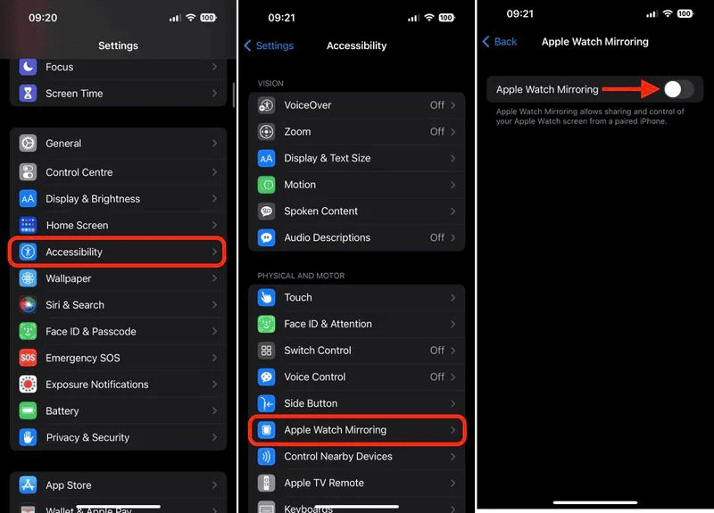Để bật tính năng này, hãy khởi chạy ứng dụng Cài đặt trên iPhone của bạn, nhấn vào Hỗ trợ tiếp cận, sau đó trong phần “Vật lý và động cơ“, nhấn vào Apple Watch Mirroring, trước khi bật tính năng này trong màn hình tiếp theo.