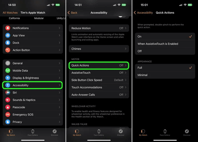 Để bật Tác vụ nhanh, hãy mở ứng dụng Đồng hồ trên iPhone của bạn, nhấn vào Hỗ trợ tiếp cận, sau đó trong “Động cơ“, nhấn vào Tác vụ nhanh. Chọn từ một trong các tùy chọn sau: Bật, Khi Bật AssistiveTouch và Tắt. Bạn cũng có thể chọn ngoại hình của chúng là Đầy đủ hoặc Tối thiểu.
