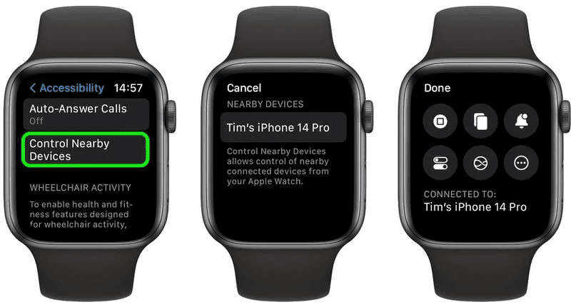 Theo một cách ngược lại của Apple Watch Mirroring, bạn cũng có thể điều khiển iPhone của mình bằng Apple Watch. Trên đồng hồ của bạn, đi tới Cài đặt -> Trợ năng, sau đó chọn Kiểm soát thiết bị lân cận. Chọn iPhone (hoặc iPad ) của bạn từ danh sách.