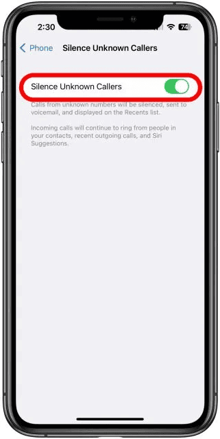 4. Bật Im lặng cho những cuộc gọi không xác định. Nó sẽ có màu xanh lục và ở bên phải khi được bật.
