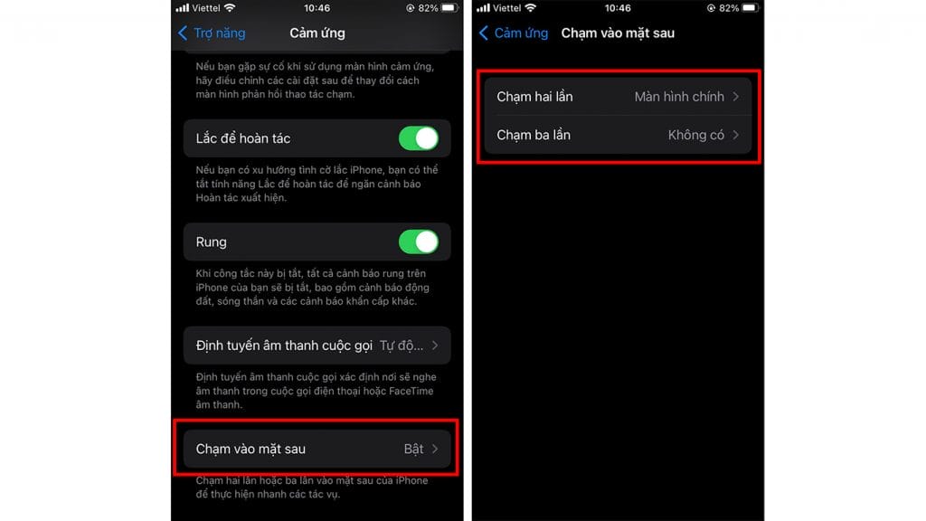 Bước 2: Bạn chọn tiếp vào mục Chạm vào mặt sau > Thiết lập các hành động Chạm 2 lần và Chạm 3 lần.