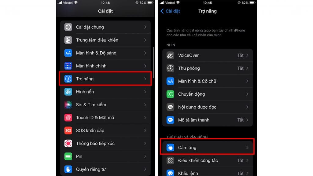 Bước 1: Bạn truy cập vào Cài đặt > Trợ năng > Cảm ứng.