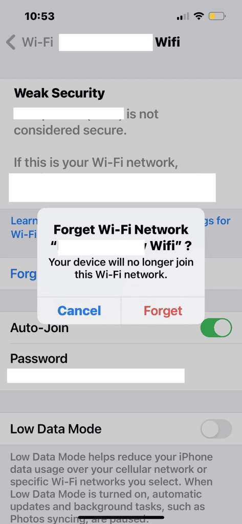Trước khi làm bất cứ điều gì phức tạp, hãy thử xóa mạng bị lỗi khỏi iPhone của bạn. Nếu không, nó sẽ tiếp tục tham gia kết nối Wi-Fi. Cách khắc phục này có thể hiệu quả nếu gần đây bạn đã thay đổi mật khẩu Wi-Fi, mạng internet của bạn bị lỗi hoặc bạn thiết lập một bộ định tuyến mới.