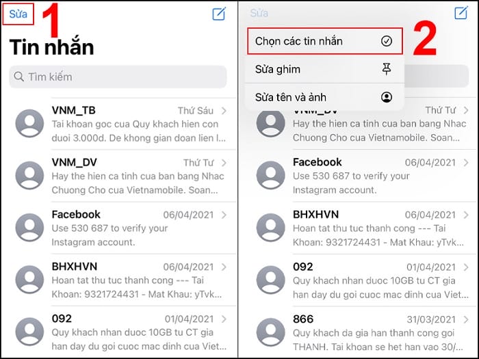 Bước 1: Mở ứng dụng Tin nhắn >> chọn mục Sửa tại góc trái.