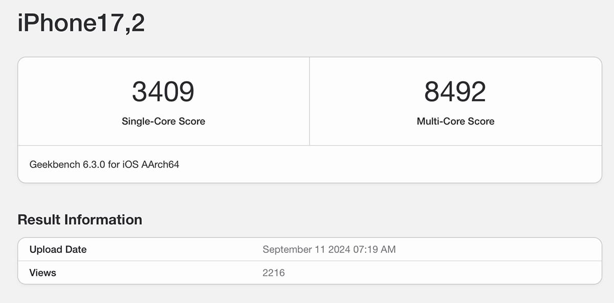 Kết quả Geekbench được tải đến từ iPhone17,2 – một mã định danh kiểu máy tương ứng với iPhone 16 Pro Max. Điều này có nghĩa là chúng ta đang xem xét chip A18 Pro của Apple.