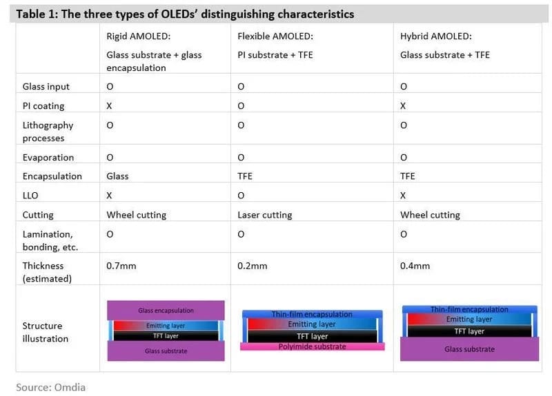Mặc dù công nghệ OLED lai vẫn chưa được hoàn thiện và sẽ mất ít nhất một năm để trở nên khả thi về mặt thương mại trước khi nó có thể được tích hợp vào OLED iPad vào khoảng năm 2024, báo cáo cho biết cả Samsung và LG đều đang theo đuổi chất nền thủy tinh siêu mỏng độ dày 0,2 mm được sử dụng với công nghệ này, giảm so với tiêu chuẩn hiện tại khoảng 0,5 mm.