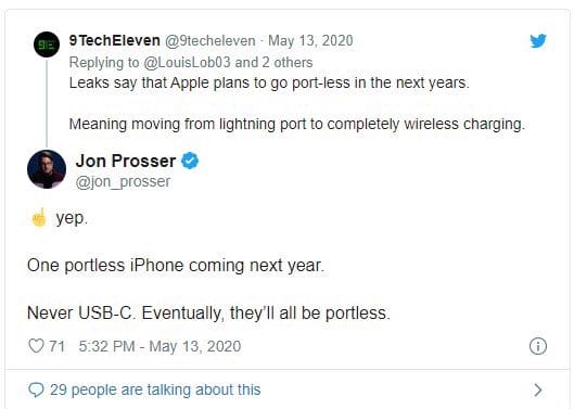 Apple sẽ trực tiếp nhảy sang một chiếc iPhone không cổng và không thực hiện chuyển đổi sang USB-C như đã làm trên dòng sản phẩm iPad Pro của mình. Điều này có nghĩa là ngay cả dòng iPhone 12 do ra mắt vào cuối năm nay cũng sẽ xuất xưởng với đầu nối Lightning chứ không phải USB-C.