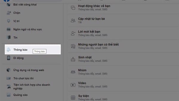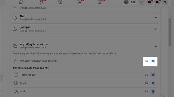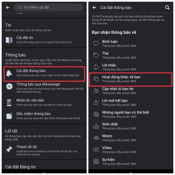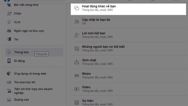 Bước 2: Cài đặt thông báo => Hoạt động khác về bạn.