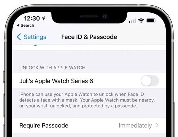 Apple đang chấm dứt tất cả những vấn đề như vậy đối với những chủ sở hữu iPhone cùng sử dụng Apple Watch bằng cách sử dụng Apple Watch làm nguồn xác thực thứ hai. Đây là cách bạn có thể mở khóa iPhone bằng Apple Watch khi đeo khẩu trang. Để kích hoạt tính năng mới này thì yêu cầu iPhone chạy iOS 14.5, Apple Watch chạy watchOS 7.4  cần truy cập tới Cài đặt => Face ID & Passcode và bật “Mở khóa bằng Apple Watch”.