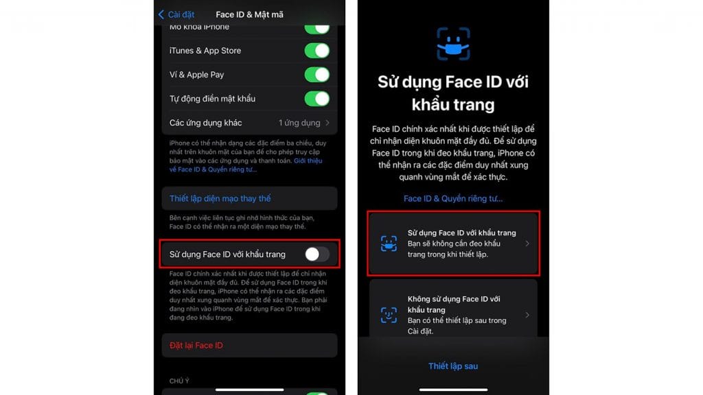 Bước 1: Để bật tính năng này bạn chọn vào Cài đặt > Face ID & Mật mã > Sử dụng Face ID với khẩu trang > Bắt đầu thiết lập.