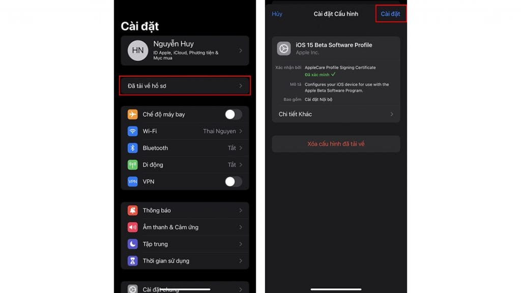 Bước 2: Tiếp theo bạn mở Cài đặt lên và chọn vào mục Hồ sơ đã tải về > Cài đặt Profile nha.