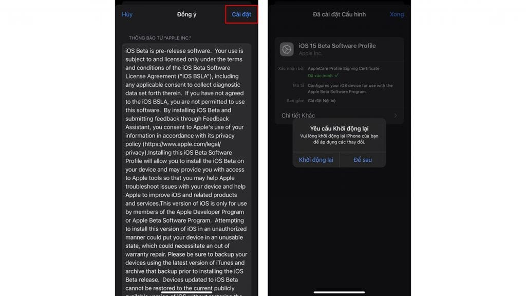 Bước 3: Bạn đồng ý Cài đặt với các điều khoản từ Apple Inc. Lúc này iPhone sẽ yêu cầu bạn khởi động lại bạn nên thực hiện điều đó ngay nhé.