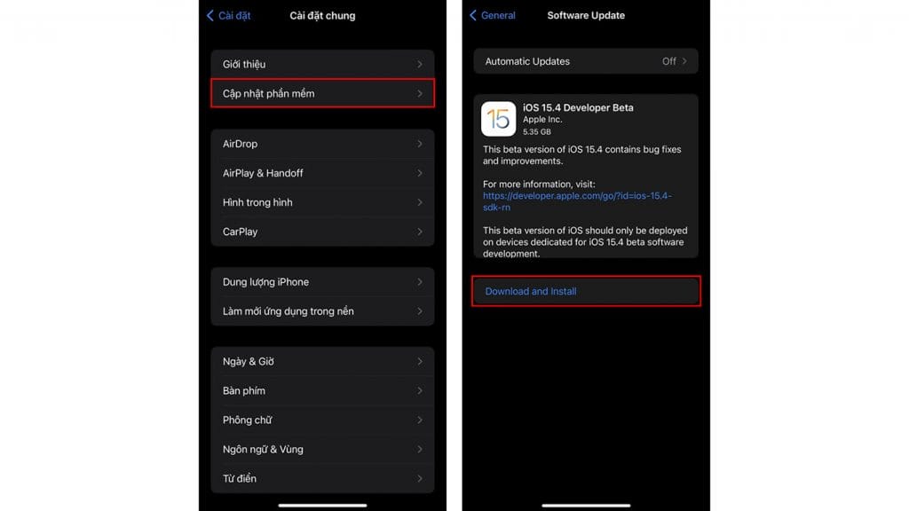 Bước 4: Cuối cùng bạn truy cập vào Cài đặt > Cài đặt chung > Cập nhật phần mềm > Tải về và cài đặt iOS 15.4 Developer Beta nhé.