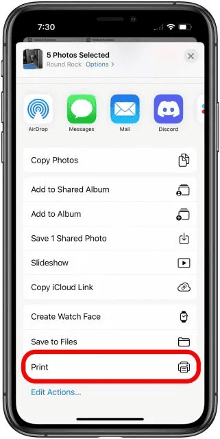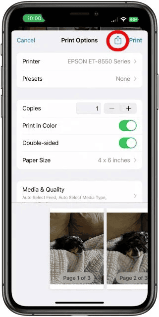 6. Trên màn hình Tùy chọn in, chạm vào biểu tượng Chia sẻ ở phía trên bên phải, bên cạnh In.