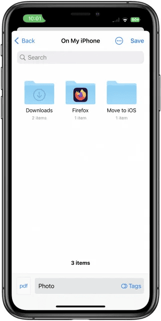 8. Bây giờ giao diện chọn tệp sẽ mở ra. Sử dụng điều này để điều hướng đến thư mục trên iPhone của bạn, nơi bạn muốn lưu tệp PDF. Bạn có thể nhấn vào “Ảnh” ở dưới cùng để thay đổi tên của tệp. Khi bạn hoàn tất, hãy nhấn vào Lưu.