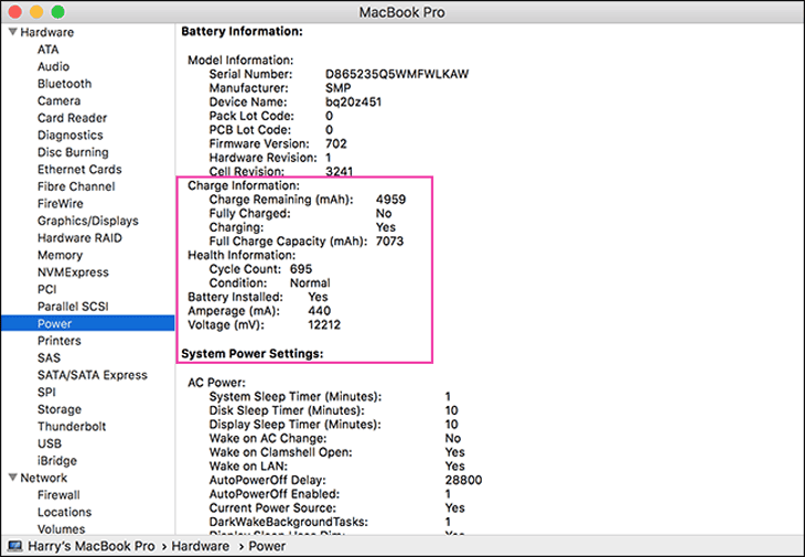 Bước 5: Ở bên phải cửa sổ, bạn sẽ thấy thông tin về pin của mình, bao gồm nhà sản xuất, dung lượng thiết kế, dung lượng hiện tại, số chu kỳ và tình trạng.