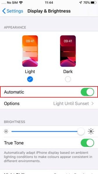 4. Nếu bạn muốn iPhone tự động chuyển giữa Light mode và Dark mode dựa theo thời gian trong ngày, hãy bật phần Automatic (Tự động)