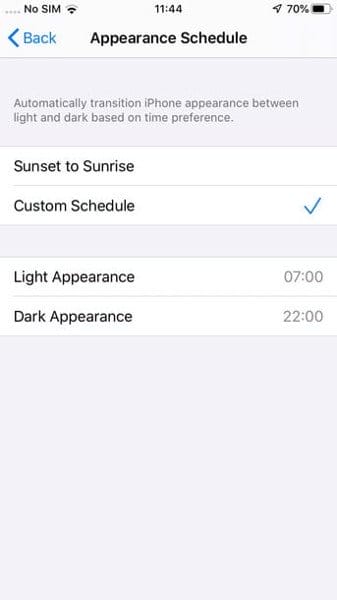 6. Lựa chọn mặc định là giữ Dark mode từ Sunset (Hoàng hôn) tới Sunrise (Bình minh). Nếu bạn muốn tự đặt lịch theo ý mình, chạm vào Custom Schedule và điều chỉnh thời gian ở phần Light Appearance – Dark Appearance để chọn lựa khoảng thời gian chế độ nào được hoạt động.