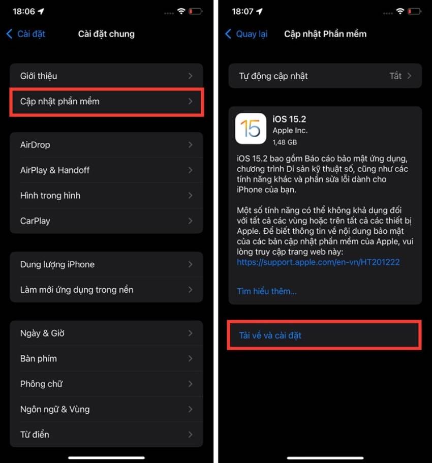 Trên giao diện của màn hình lúc này sẽ có mục Cập nhật phần mềm (mục thứ 2 – ở dưới phần Giới thiệu). Ở giao diện lúc này sẽ hiển thị phiên bản iOS mới nhất với các tính năng và đặc điểm nổi trội. Bạn hãy nhìn xuống dưới cùng sẽ thấy dòng chữ màu xanh “Tải về và cài đặt”. Lúc này, người dùng cần nhấn vào đó để điện thoại được update phiên bản mới nhất.