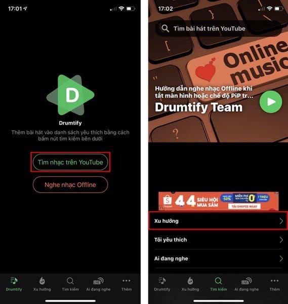 Bước 2. Mở ứng dụng lên, bạn sẽ thấy hai nút lựa chọn là Tìm nhạc trên YouTube và Nghe nhạc Offline. Tại mục Tìm kiếm, bạn có thể tìm video bài hát yêu thích để nghe trên YouTube.