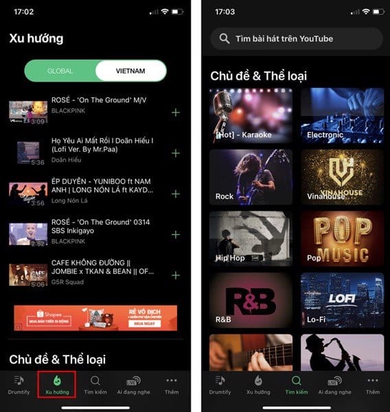 Bước 3. Trong mục Xu hướng, bạn sẽ có các MV ca nhạc đang thịnh hành tại Việt Nam hoặc Quốc Tế. Ngoài ra, còn phân ra nhiều Chủ đề & Thể loại cho bạn lựa chọn.