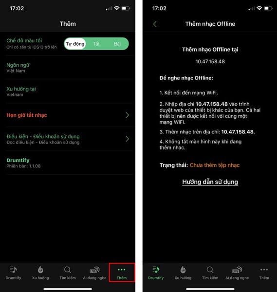 Bước 6. Tại phần Thêm, bạn có thể thay đổi chế độ màu tối, hẹn giờ tắt nhạc,… Còn nếu muốn Thêm nhạc Offline, bạn có thể làm theo hướng dẫn của ứng dụng là thêm nhạc vào địa chỉ: 10.47.158.48 là xong.