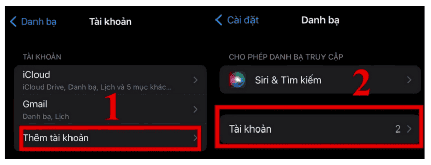 - Bước 6: Để thực hiện cách sao chép danh bạ từ Android sang iPhone, bạn vào Cài đặt trên iPhone của mình → Chọn Danh bạ → Chọn Tài khoản → chọn Thêm tài khoản để thêm tài khoản sao chép danh bạ từ iPhone lên Gmail.