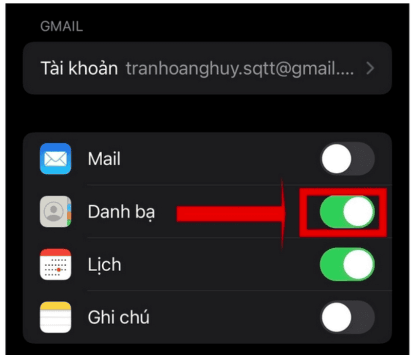 - Bước 9: Sau khi đã nhập tài khoản Gmail trên iPhone, bạn bật công tắc sang màu xanh và nhấn Lưu để kích hoạt chức năng sao chép danh bạ từ iPhone sang Gmail.