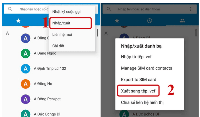 - Bước 3: Trong menu tiếp theo, chọn Xuất sang tệp .vcf để xuất danh bạ ra tệp vCard.