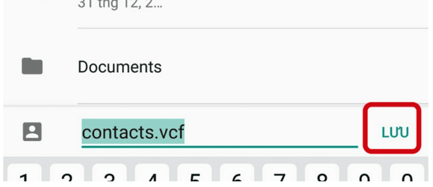 - Bước 5: Chọn nơi lưu, đặt tên file .vcf → Nhấn Lưu để lưu file .vcf vào thiết bị Android.