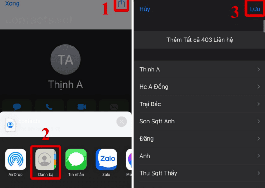 Đặt tên file .vcf → Nhấn Lưu