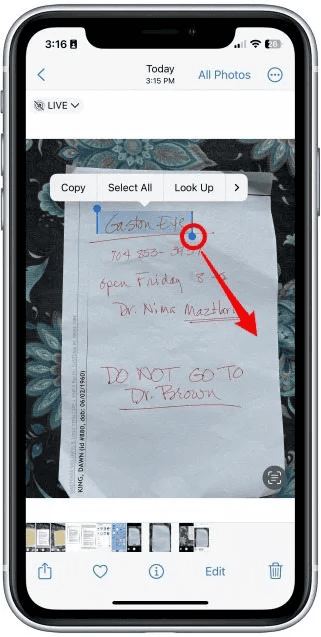 4. Nhấn và giữ văn bản trong ảnh để bắt đầu đánh dấu. Kéo các thanh đánh dấu để bao gồm văn bản bạn muốn sao chép.