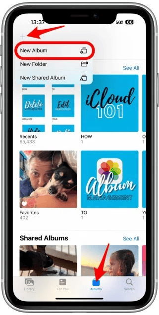 1. Tạo album ảnh trên iPhone của bạn bằng cách mở ứng dụng Ảnh và nhấn vào Album. Sau đó, ở góc trên cùng bên trái, hãy nhấn vào biểu tượng + và chọn Album mới.