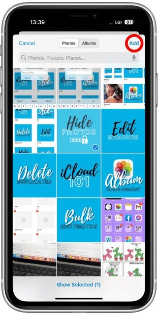 3. Bây giờ bạn sẽ có thể chọn ảnh để thêm vào album. Nếu bạn muốn album vẫn trống và thêm ảnh sau, hãy nhấn Hủy. Để chọn ảnh ngay bây giờ, chỉ cần nhấn vào chúng và xem dấu kiểm màu xanh lam xuất hiện. Bạn có thể chọn bao nhiêu tùy thích hoặc chỉ một. Nếu bạn chọn ảnh từ nhiều album khác nhau hoặc cuộn nhiều, bạn có thể chạm vào Hiển thị ảnh đã chọn để xem tất cả ảnh bạn sắp thêm vào album. Khi bạn đã sẵn sàng, hãy nhấn vào Thêm.