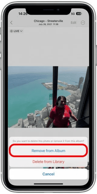 5. Nếu bạn đã thêm ảnh mà bạn muốn xóa, hãy nhấn vào ảnh để mở ảnh đó và nhấn vào biểu tượng thùng rác ở dưới cùng bên phải của màn hình. Chọn Xóa khỏi Album để chỉ xóa nó khỏi album đó hoặc Xóa khỏi Thư viện để xóa vĩnh viễn, kể cả khỏi các album khác và thậm chí cả Thư viện Ảnh được Chia sẻ.