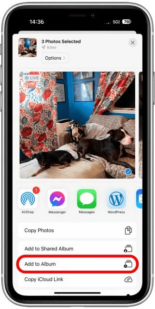 6. Để di chuyển ảnh sang album khác, bạn cần chọn ảnh muốn di chuyển trong album, chạm vào biểu tượng chia sẻ ở góc dưới bên trái màn hình, sau đó chọn Thêm vào Album. Bạn sẽ có thể chọn một album để sao chép chúng vào và bạn sẽ có tùy chọn để tạo một album mới. Khi bạn di chuyển ảnh, bạn vẫn cần xóa chúng khỏi album gốc bằng cách làm theo bước 5.
