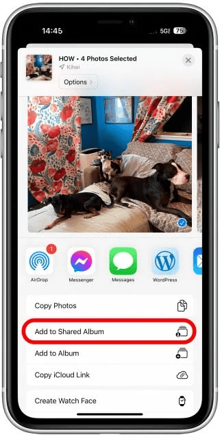8. Tại đây, bạn sẽ thấy một số tùy chọn chia sẻ, bao gồm AirDrop và các ứng dụng bạn sử dụng gần đây. Bạn cũng có thể chọn Thêm vào Album được chia sẻ.