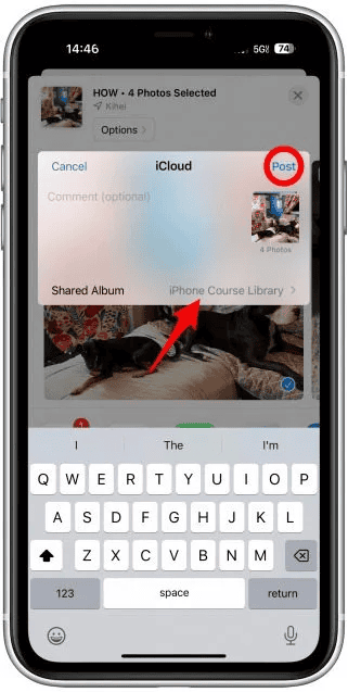 9. Bên cạnh Album được chia sẻ, bạn sẽ thấy tên của một trong những Album được chia sẻ được sử dụng gần đây nhất của mình. Nếu bạn chọn Post thì ảnh sẽ được thêm vào đó. Ngoài ra, bạn có thể thêm nhận xét tùy chọn nếu muốn giải thích hoặc mô tả ảnh.